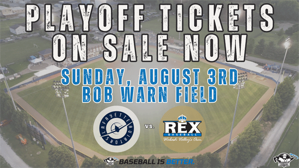 "REX Baseball are Central Division Champions & will host the 2025 Prospect League Eastern Conference Championship at Bob Warn Field on Sunday, August 3rd with a 4:35 PM EST first pitch!" Click here to buy your ticket!" |